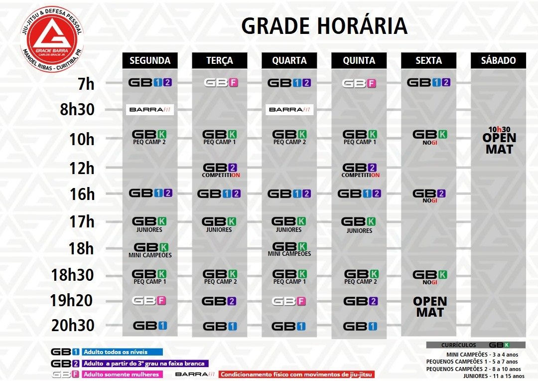 Compreendemos que iniciar ou manter uma rotina de treinos pode ser desafiador. Como escola, buscamos facilitar ao máximo sua agenda, oferecendo uma ampla variedade de horários e modalidades para você e sua família. Confira nossa grade completa de horários e opções de treinos abaixo.